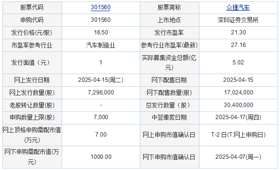 公司次要处置汽车热办理系统细密加工零部件的研发、出产和发卖,次要产物包罗汽车空调热互换器及管系统、油冷器、热泵系统、电池冷却器、汽车策动机系统等汽车零部件。截至2025年4月3日,公司股东孙文伟间接持有公司3,355。92万股股份,占公司总股本的36。80%;同时,孙文伟为众诺精的施行事务合股人,持有众诺精37。16%的财富份额,同时对众诺精持有的公司股份之表决权享有独有排他的,因而,孙文伟通过众诺精间接节制公司438。00万股股份,占公司总股本的4。80%。孙文伟节制的有表决权的股份占公司总股本的41。60%。目前,孙文伟担任公司的董事长和总司理,能现实节制公司的成长标的目的,可以或许对股东大会、董事会决议以及公司董事、监事和高级办理人员的提名和任免发生本色性影响,系公司控股股东、现实节制人。众捷汽车2025年4月3日披露的初次公开辟行股票并正在创业板上市招股意向书 显示,公司拟募资42,199。99万元,用于数字化智能工场扶植及扩产项目、新建研发核心项目和弥补流动资金。众捷汽车2025年4月14日披露的初次公开辟行股票并正在从板上市刊行通知布告显示,按本次刊行价钱16。50元/股、刊行新股3,040。00万股计较,若本次刊行成功,扣除估计刊行费用约7,843。91万元(不含)后。